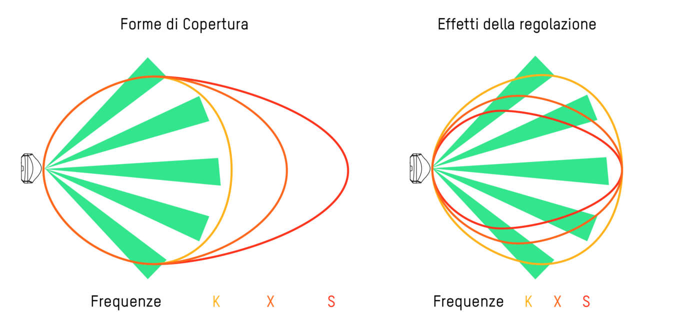 Nel caso delle microonde in Banda S e Banda X, con la loro forma del lobo allungata, risulta pressoché impossibile raggiungere la condizione di pattern shaping; inoltre, qualsiasi tentativo mediante regolazione invasiva porterebbe a un’elevata riduzione laterale della copertura delle microonde, lasciando zone scoperte. L’impiego della microonda in Banda K consente invece di sfruttare al massimo le potenzialità dei rilevatori a doppia tecnologia, aumentando la precisione e l’immediatezza nella rilevazione delle intrusioni.
