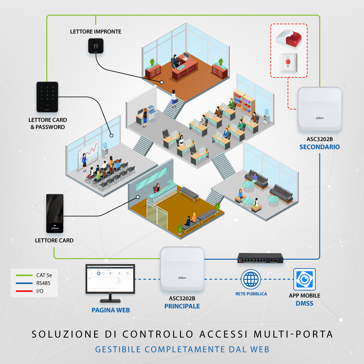 ASC3202B è la nuova centralina standalone della serie Insider Dahua totalmente configurabile e gestibile da pagina web. Si tratta di una vera e propria rivoluzione per il controllo accessi Dahua: il dispositivo, programmabile come controller principale (o secondario), ne supporta 19 in cascata per raggiungere fino a 40 porte. Questo significa poter gestire impianti anche piuttosto estesi e strutturati in qualunque scenario direttamente dalla pagina web del prodotto senza dover ricorrere a piattaforme software aggiuntive.