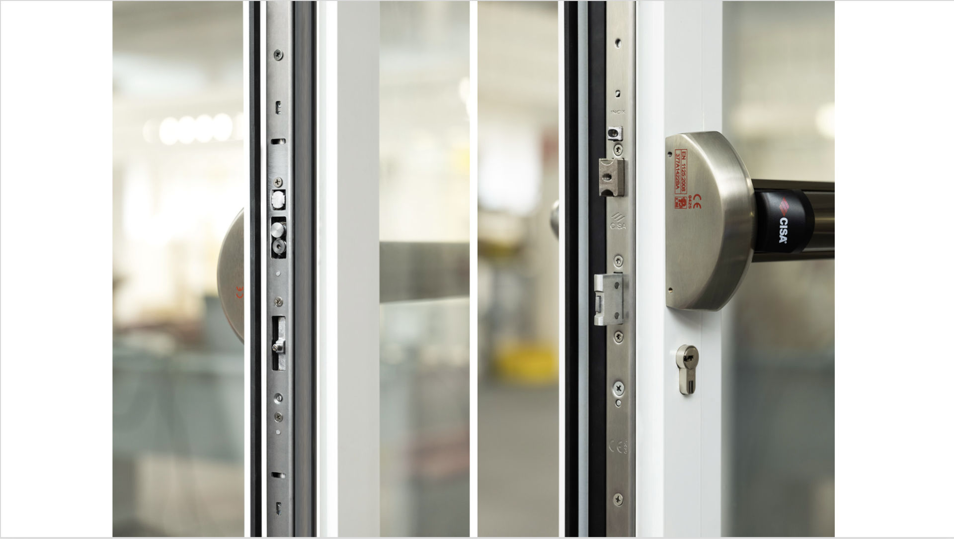 CISA Multitop Matic EXIT garantisce una chiusura automatica e sicura di entrambe le ante della porta, senza bisogno della chiave. Non è necessario chiudere le uscite di emergenza manualmente al termine della giornata. Quando l’anta principale viene accostata al montante fisso, i tre scrocchi e i ganci si attivano automaticamente, assicurando la chiusura istantanea con sei punti di chiusura, il massimo grado di security a livello europeo. Nel caso di porte a due ante, la controserratura e il riarmo automatico attuano la chiusura istantanea in sicurezza anche dell’anta secondaria.