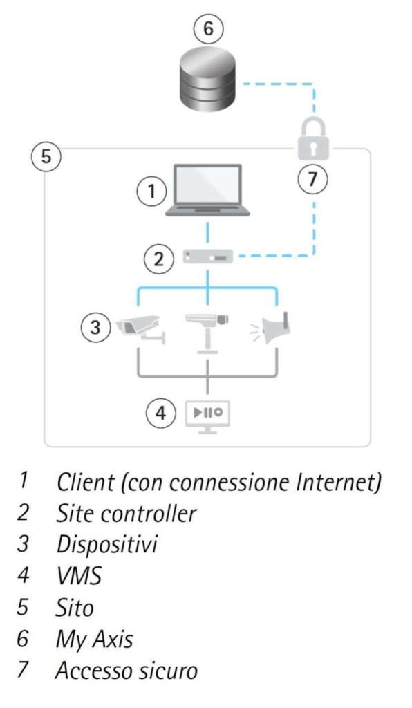 Nella configurazione per un singolo sito, l’applicativo on site e il site controller sono interconnessi e si collegano alla piattaforma di servizio Axis per l’aggiornamento dei firmware e altre informazioni di assistenza.