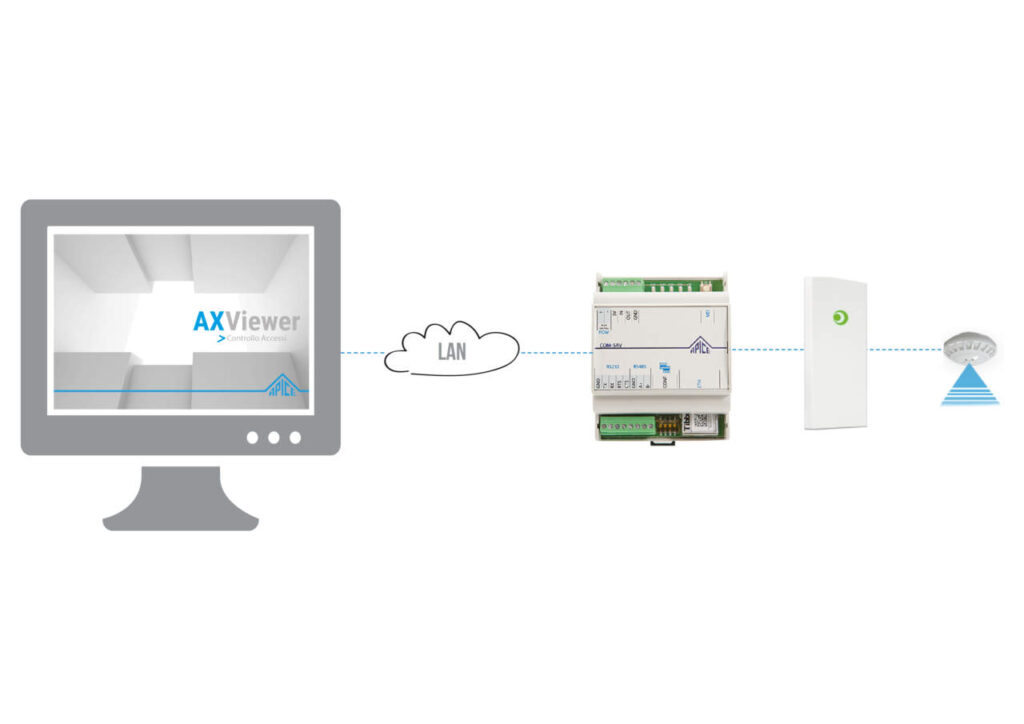 Il sistema – composto da lettori UHF (866 MHz) GAT DUO, da un sensore di presenza a infrarossi, da un’interfaccia RS485/ Ethernet (COM-SRV) e dal software AxViewer – consente di effettuare la lettura di badge UHF che attraversano un determinato varco.