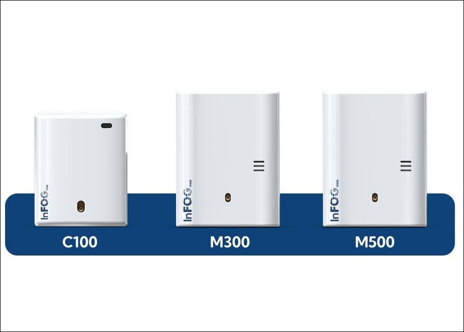 Il modello intermedio I n FOG-M 300 misura 30,1×39,2×13,9 cm e spara fino a 300 mc (per esempio, in un ambiente di 100 m2 con altezza di 3 m si può arrivare fino a 900 mc totali), mentre il top di gamma InFOG-M500 ha gli stessi ingombri di In- FOG-M300 ma arriva a sparare fino a 500 mc (che su un ambiente di 170 m2 e altezza 3 m o 125 m2 e altezza 4 m equivalgono a 1.500 mc totali).