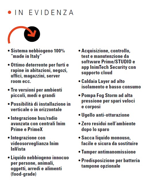 Il nuovo sistema di Inim genera una coltre di nebbia artificiale, che disorienta in pochi secondi ladri e rapinatori costringendoli alla fuga. È disponibile in tre versioni per spazi piccoli, medi e grandi e si integra con le centrali Prime e PrimeX.
