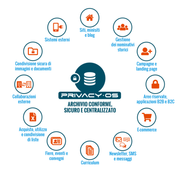 Privacy·OS è il primo sistema al mondo per la gestione sicura delle informazioni personali con finalità di marketing. A differenza di numerose soluzioni GDPR presenti sul mercato, Privacy·OS non si limita a produrre la documentazione ma raccoglie e gestisce concretamente i dati personali di clienti e prospect.