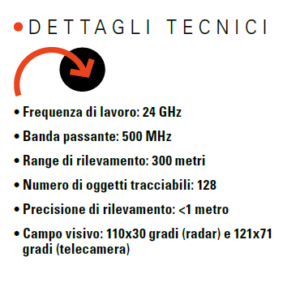 Il sistema utilizza la tecnologia FMCW per mi­surare la distanza, la velocità e la direzione degli oggetti in movimento; è in grado di rilevare tar­get fino a una distanza di 300 metri e di tracciare fino a 128 oggetti contemporaneamente.