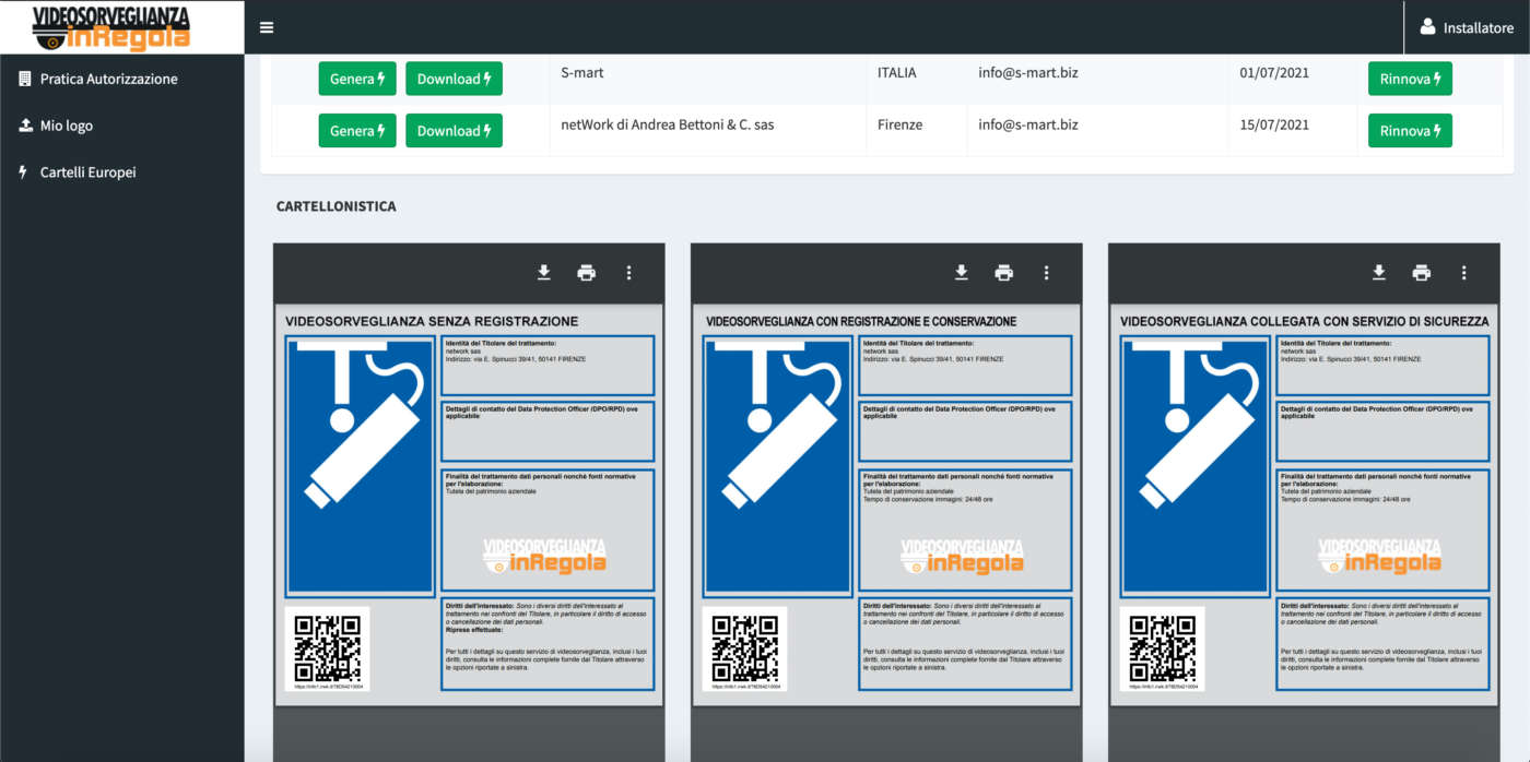 Il servizio VideosorveglianzainRegola di netWork (FI) si occupa della regolarizzazione degli impianti, svolgendo tutti gli step necessari, dalla creazione dei cartelli e dei documenti fino all’invio della documentazione.