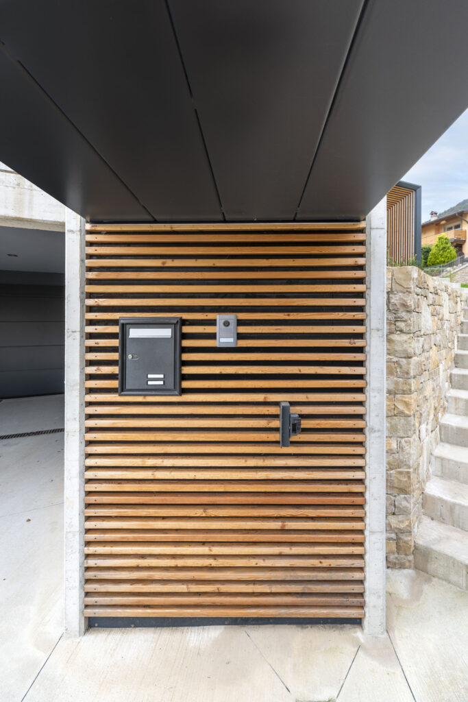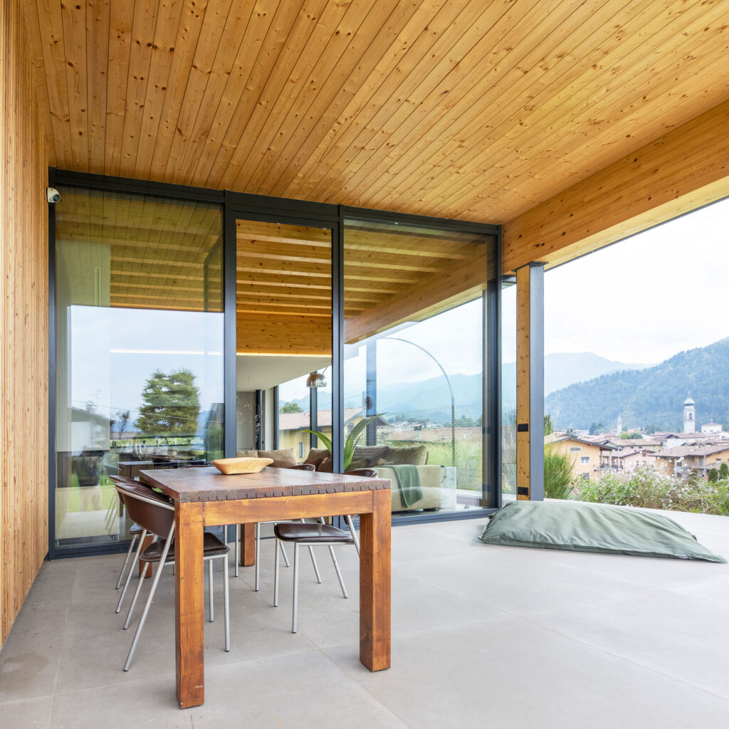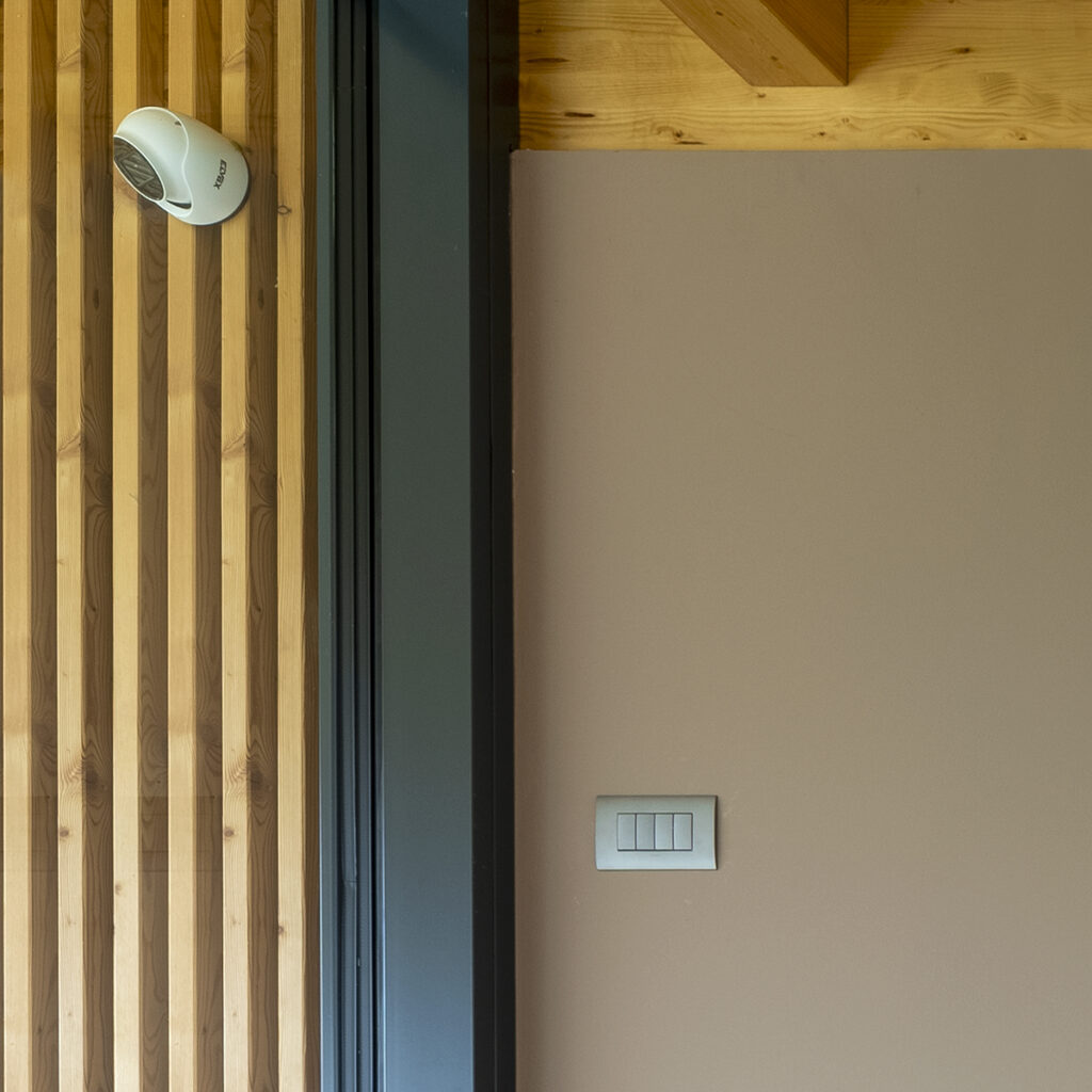 Ampie superfici vetrate, viste panoramiche e spazi aperti caratterizzano l’involucro della struttura, favorendo l’ingresso della luce naturale e la continuità tra interno ed esterno, mentre una scala centrale in legno, a sbalzo, collega i livelli, diventando elemento architettonico di forte valenza visiva. L’impiego del legno di larice nei rivestimenti interni ed esterni e nelle travi del tetto, insieme a cromie ispirate alla terra, rafforza il legame con l’ecosistema montano e il camino, dal disegno essenziale, costituisce il fulcro della zona giorno, diffondendo calore e contribuendo all’atmosfera accogliente dell’abitazione. In un contesto architettonico così aperto e permeabile, la progettazione ha richiesto soluzioni altamente specializzate.