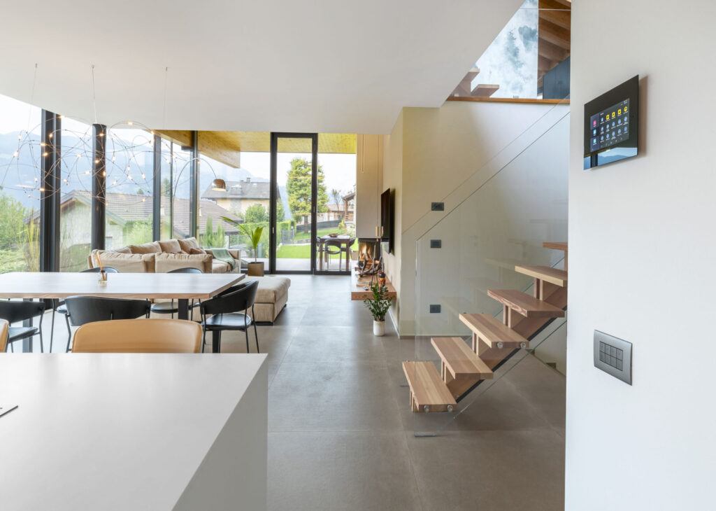 L’installazione del sistema domotico By-me Plus di Vimar permette di gestire in modo sinergico tutte le funzioni dell’abitazione, come la regolazione dell’illuminazione e della temperatura, le automazioni per tende e tapparelle, il controllo dei consumi elettrici, i carichi dei singoli elettrodomestici e molto altro ancora. Questo sistema ottimizza il clima domestico e l’equilibrio luminoso per un risparmio energetico ottimale, oltre a promuovere un benessere sostenibile, eliminando gli sprechi superflui; inoltre, grazie al controllo da remoto tramite l’app View, la gestione dell’abitazione è possibile da qualunque luogo attraverso un’interfaccia intuitiva e di facile utilizzo.