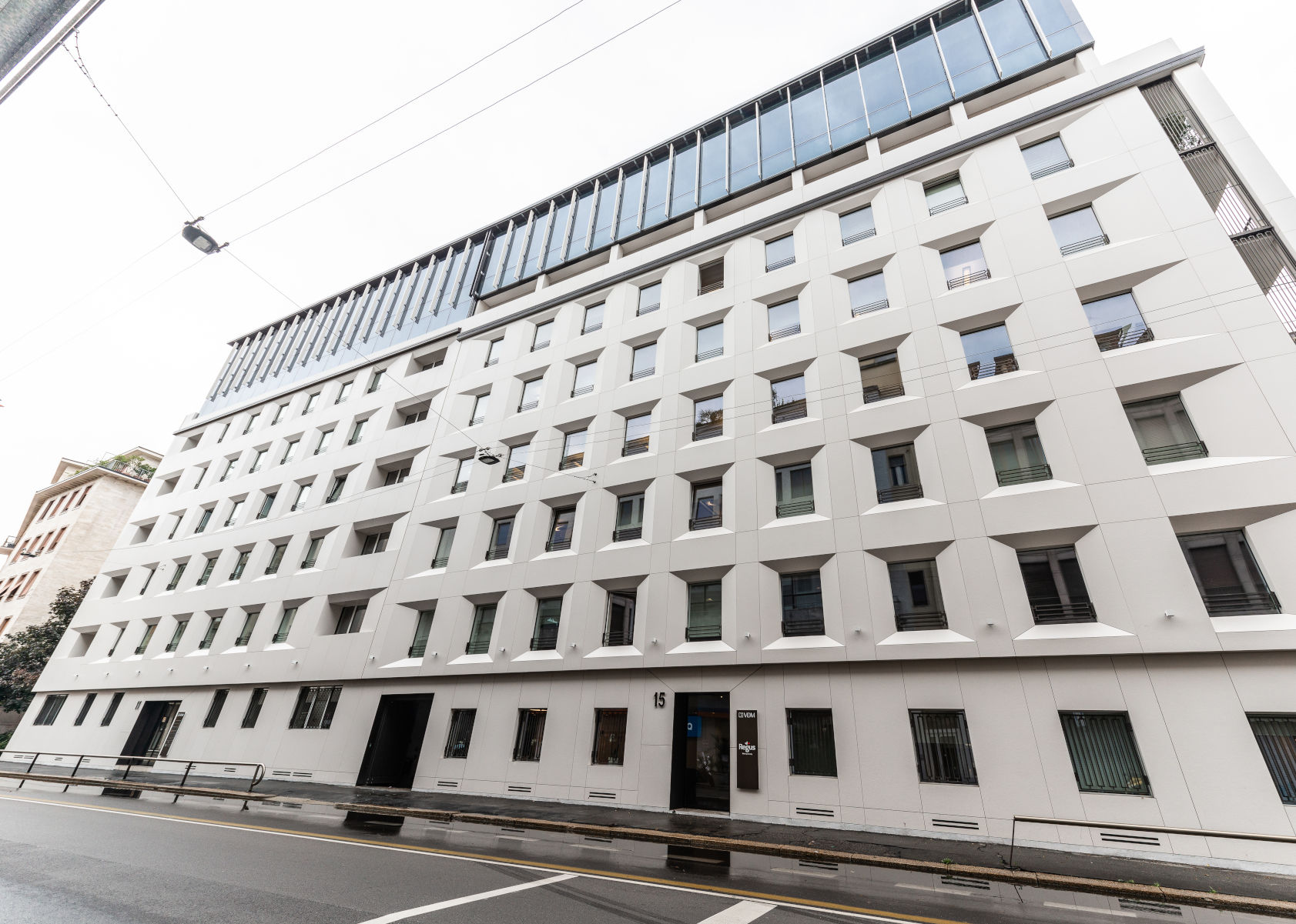 Il risultato è la fusione di due edifici (precedentemente separati) in un unico complesso, che comprende sette piani fuori terra e una terrazza green: le nuove facciate con cappotto termico e il sopralzo in vetro conferiscono alla struttura un aspetto contemporaneo ed energeticamente efficiente, che contribuisce a distinguerla positivamente nella zona; anche l’ambiente interno si presenta accogliente e moderno nel design, in abbinamento al quale sono stati integrati i dispositivi di controllo degli accessi dormakaba.