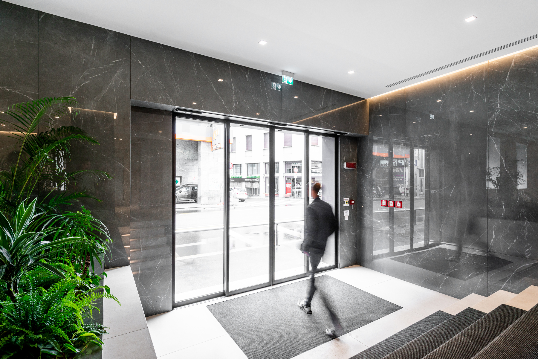 Gli ingressi dell’edificio sono presidiati dalle porte scorrevoli automatiche dormakaba ST Flex Green, con un design a profili sottili a taglio termico e funzione ridondante e l’azionamento integrato con eleganza nel soffitto ribassato.