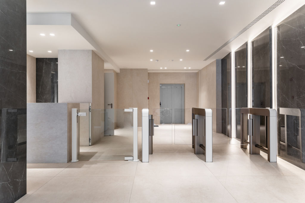 Nell’area della reception, sono stati installati due varchi automatici dormakaba Argus 40 con larghezza di 900 mm ciascuno, completi di ante alte 1000 mm. Le dimensioni, più ampie rispetto a quelle della versione standard, consentono il passaggio anche di disabili e piccole merci in transito, garantendo al tempo stesso il controllo dei flussi in ingresso e in uscita.