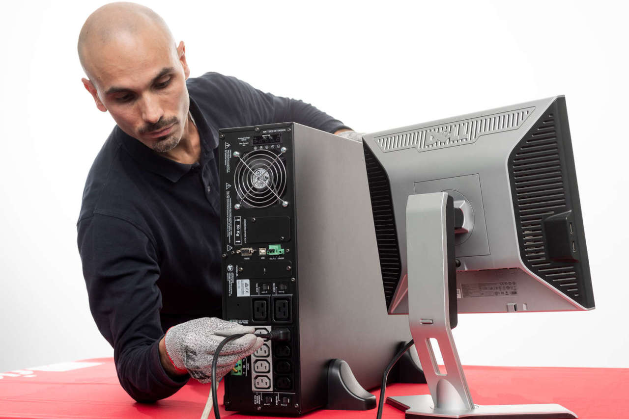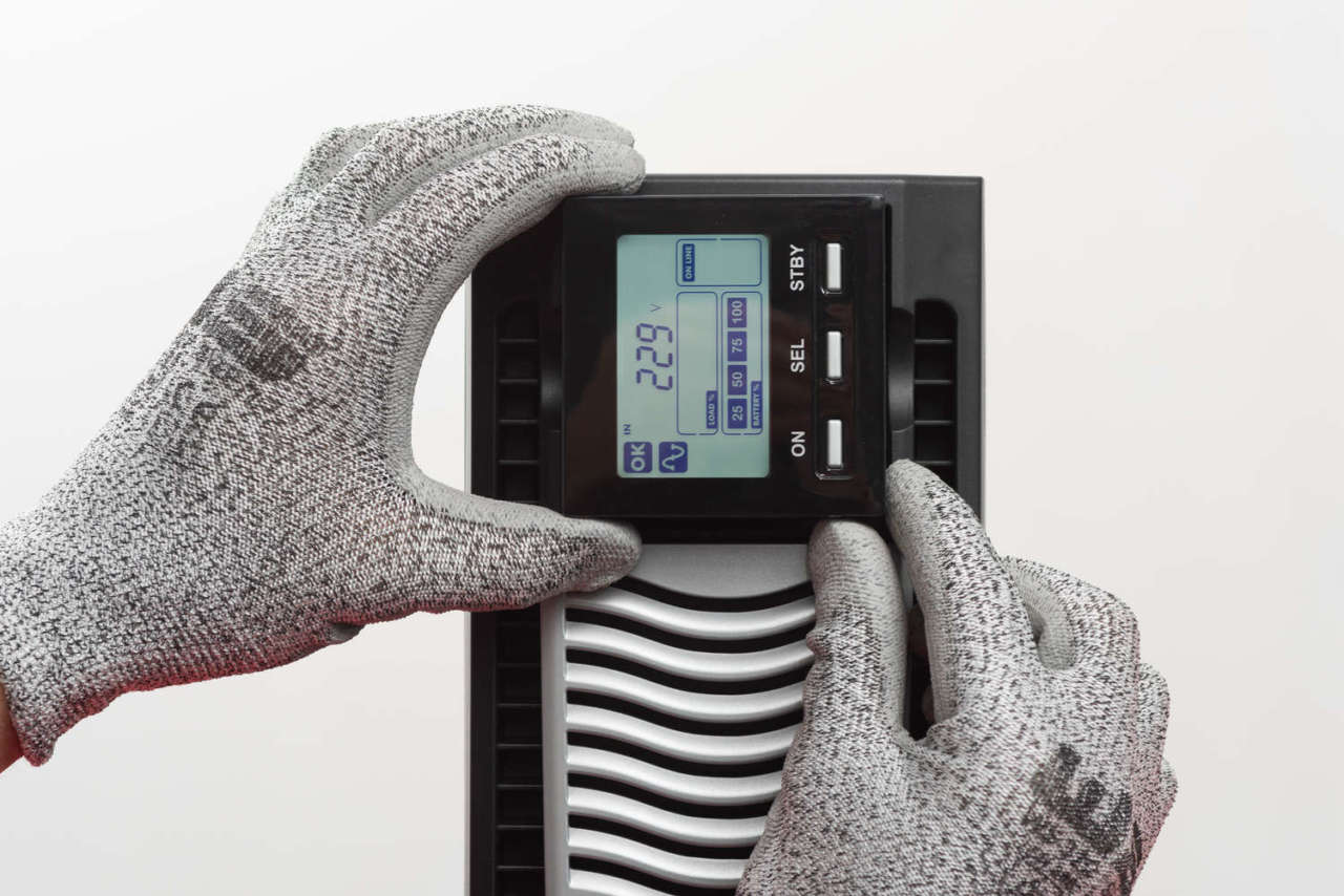 «Collocare l’UPS e l’eventuale Battery Box in ambienti aerati, puliti, riparati dalle intemperie, dalla luce diretta del sole e da aria calda, con umidità relativa non superiore ai valori massimi indicati nel manuale d’installazione e temperatura ambiente tra 0 e 40 gradi. La temperatura consigliata di funzionamento e delle batterie è compresa tra 20 e 25°C per una vita operativa media di 5 anni. L’UPS è predisposto per l’installazione in configurazione tower, tramite gli appositi due piedini di sostegno. Per l’installazione in rack, estrarre la maschera del display con delicatezza, ruotarla di 90° in senso antiorario e reinserirla nell’apposito alloggio; fissare le maniglie laterali ed inserirlo nell’armadio rack sulle apposite staffe di sostegno a L. Dato il peso elevato, è consigliabile posizionare UPS e Battery Box nella parte bassa dell’armadio. Per i collegamenti elettrici raccomandiamo l’uso di cavi multipolari a doppio isolamento con 3 fili all’interno da collegare rispettivamente ai morsetti di input, output e bypass».