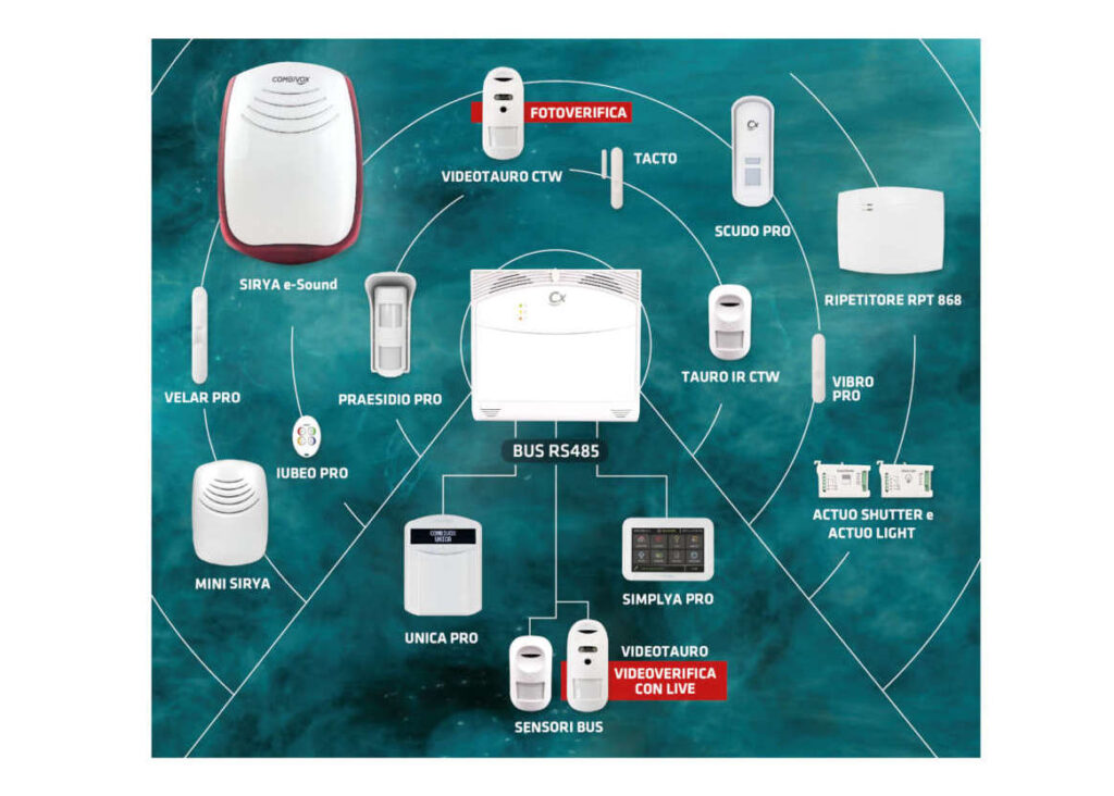 Infine, possie­de uscite BUS RS 485 per i moduli filari quali: le tastiere Unica PRO e Simplya PRO, gli inseritori indoor e outdoor, la sirena Sirya, gli alimentatori supplementari e i rivelatori BUS, compresi i nuovi VideoTauro BUS con funzione di videoverifica e videocontrollo tramite Combivox Cloud Video.