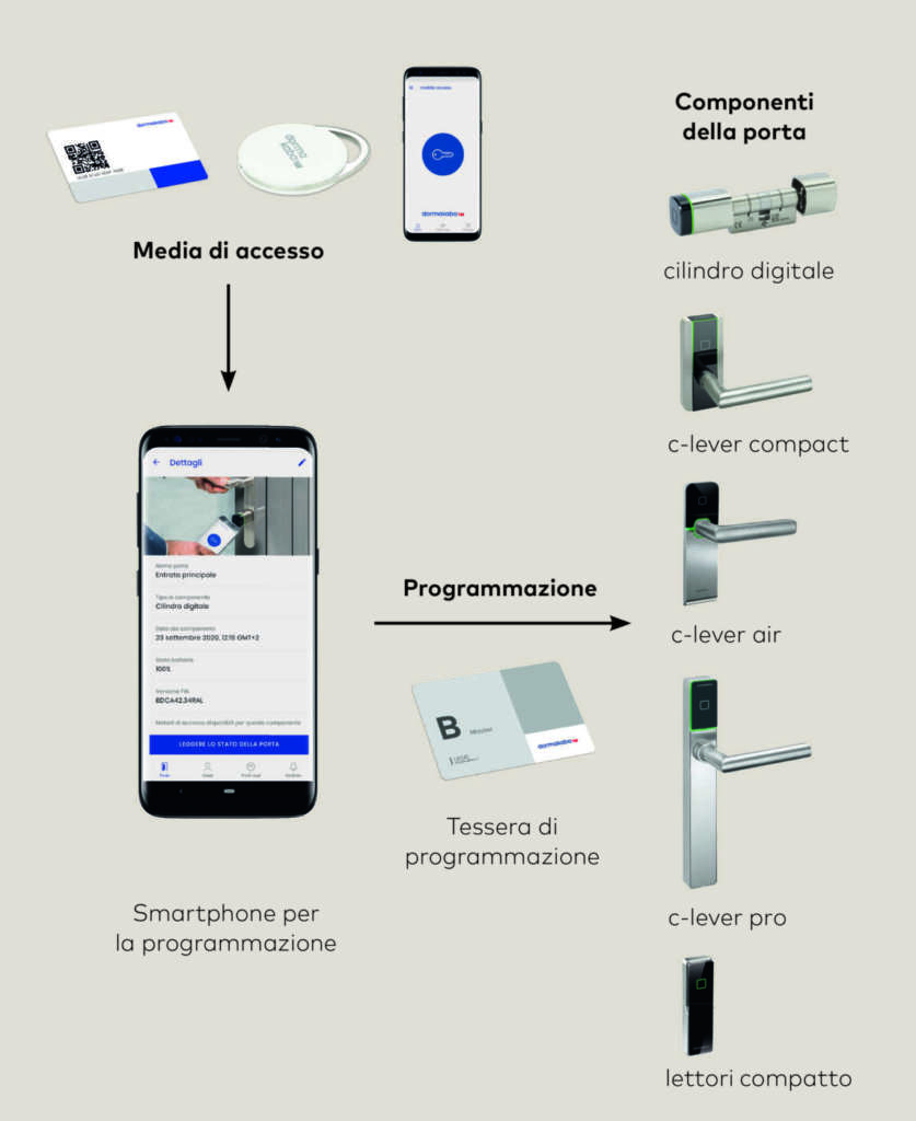 In seguito alla registrazione dei supporti fisici e delle chiavi virtuali, l’app evolo smart consente di creare e passare in tutta semplicità ai dispositivi porta – mediante tecnologia NFC (Near Field Communication) o Bluetooth Low Energy (in base al tipo di smartphone utilizzato) – la lista del personale o dei familiari da autorizzare all’accesso. Diventa così possibile autorizzare puntualmente sui diversi varchi della struttura le tessere, i portachiavi e le chiavi virtuali, determinando quali persone hanno accesso a quali porte della proprietà.