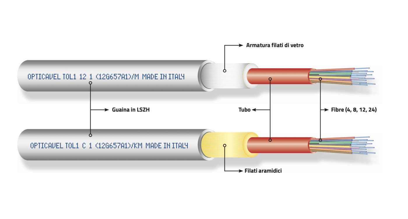 La nuova linea di cavi è composta da modelli FTTH (Fiber To The Home) monofibra e multifibra, e da cavi mono­tubo e multitubo. Sono disponibili modelli armati e non armati per ogni tipologia dei seguenti cavi: