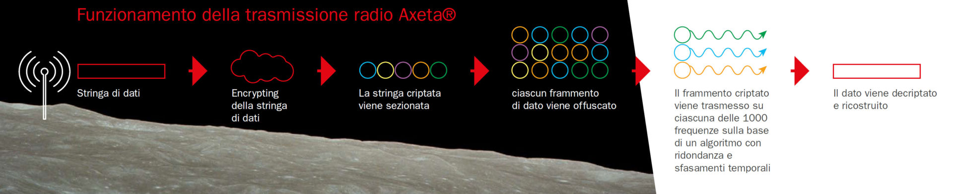 Grazie a queste due peculiarità, il sistema Axeta® è altamente resistente ai disturbi più forti, ai jammer multifrequenza/banda e alle intercettazioni (la capacità crittografica insita nella tecnica di modulazione e demodulazione del segnale è elevata).