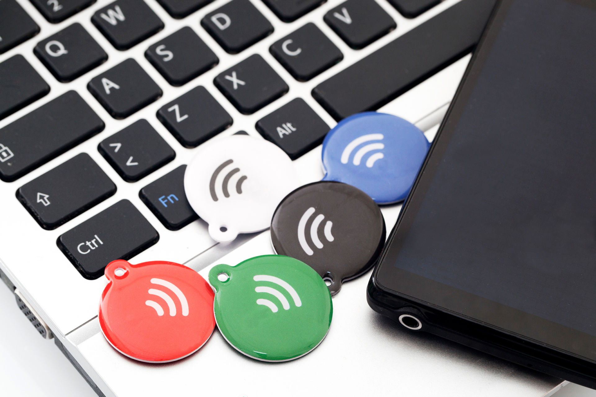 I tag NFC hanno varie forme (portachiavi, tessere, adesivi ecc.) e possono essere di tipo passivo (cioè alimentati direttamente dal lettore tramite il campo magnetico), attivo (con batteria interna per incrementare la distanza di comunicazione fino a 200 metri) o ibrido (semi-passivo o semi-attivo con batteria integrata per funzioni limitate).