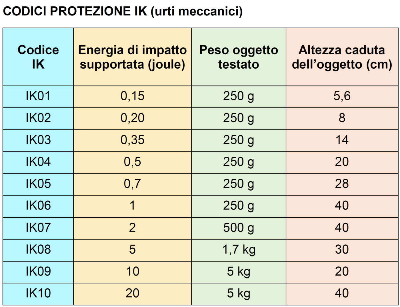 Codici protezione IK contro gli urti meccanici (Fonte: Norma CEI 70-4)