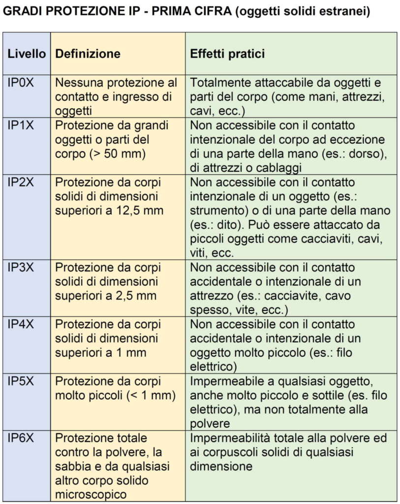 Gradi protezione IP – prima cifra, riferita all’ingresso di oggetti solidi estranei (Fonte: Norma CEI 70-1)