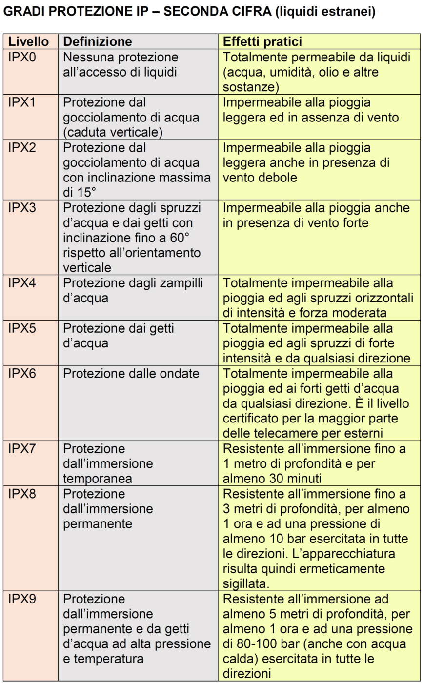 Gradi protezione IP – seconda cifra, riferita all’ingresso di liquidi estranei (Fonte: Norma CEI 70-1)