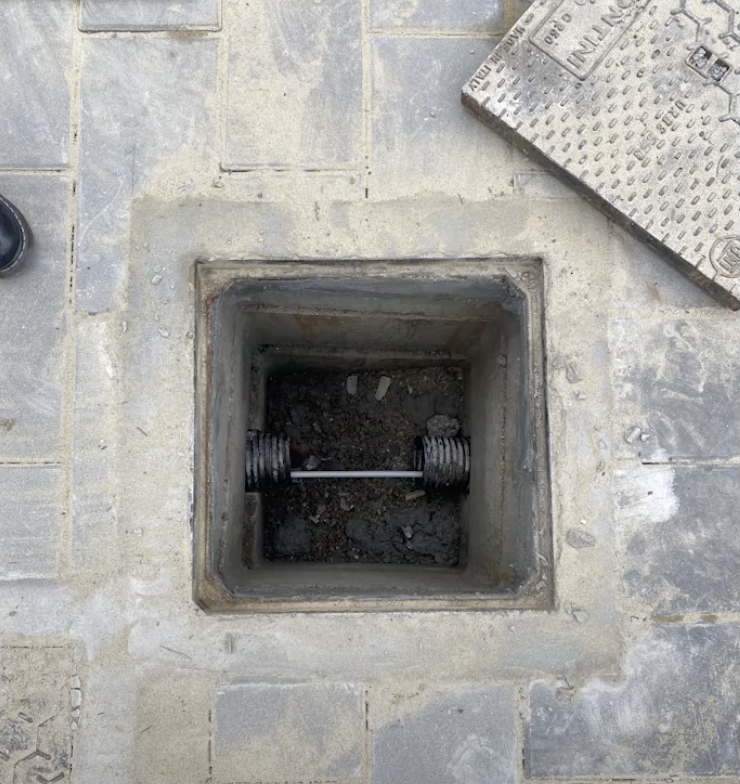 • basamento ipogeo (profondità di 1.250 mm per un’altezza di 600 mm) dotato di zanche per il solido ancoraggio a terra e l’alloggiamento del cilindro e del sistema di alimentazione, movimentazione, comando e controllo;
