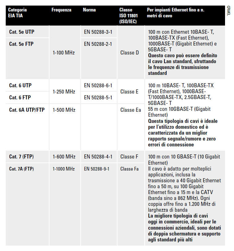 I cavi Lan seguono le specifiche standardizzate TIA/EIA per la suddivisione in varie categorie (Cat.x), in base alle proprietà elettriche, al tipo di isolamento adottato e altri parametri. Al momento i cavi più diffusi a livello commerciale e industriale sono quelli di categoria 5e (Cat.5e), 6 (Cat.6), 6a (Cat.6a), 7 (Cat.7) e 7a (Cat.7a). La lettera dopo il numero identifica le migliorie apportate alla categoria numerica: la “e” sta per “enhanced” (avanzato, migliorato, maggiorato) mentre la “a” per “augmented” (aumentato).