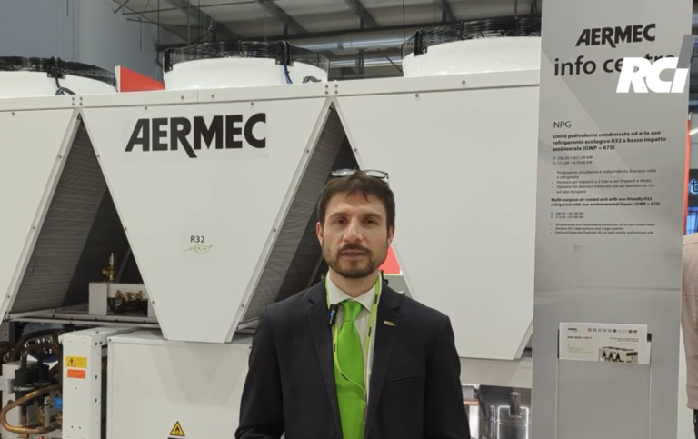 Alessio Gattone, responsabile marketing tecnico di Aermec, illustra le caratteristiche della NPG a R32, una macchina polivalente con struttura V-Block con compressori scroll ottimizzati per questo refrigerante a basso GWP.
