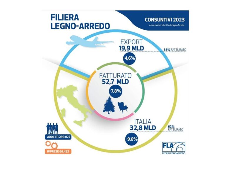 Diffusi da FederlegnoArredo i numeri dei consuntivi che fotografano l’anno 2023 della filiera legno-arredo. Circa 66.500 aziende (14,8% del manifatturiero nazionale) e 300.000 addetti, (8% del manifatturiero nazionale), un fatturato da 52,7 miliardi di euro (il 4,2% del manifatturiero nazionale), l’export che sfiora quota 20 miliardi, il mercato interno poco sotto i 33 miliardi e…