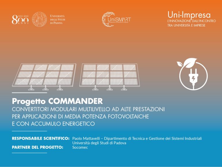 Il progetto è dedicato allo sviluppo di convertitori modulari multilivello ad alte prestazioni per applicazioni di media potenza fotovoltaiche e con accumulo energetico Il progetto Commander, sviluppato in partnership dall’Università degli Studi di Padova con Socomec, è dedicato allo sviluppo di sistemi innovativi di conversione per l’energia elettrica ad alta efficienza attraverso l’utilizzo di convertitori…