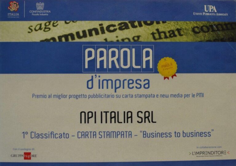 Consapevole della particolare importanza che la comunicazione aziendale assume in presenza di contesti economici poco favorevoli, NPI Italia ha partecipato, in qualità di associata ANIMA, alla seconda edizione di “Parola d’impresa”: il riconoscimento nel mondo della comunicazione, riservato alle Piccole Medie Imprese, organizzato da Piccola Industria di Confindustria e Upa con il sostegno del Sole…