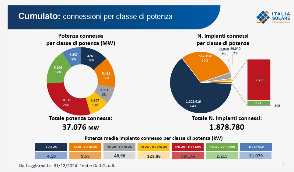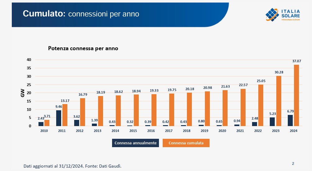 Italia Solare diffonde i dati del fotovoltaico in Italia al 31 dicembre 2024: una crescita annuale del 30% con più di 37 GW di capacità installata che si affianca, però, a un calo delle installazioni all’interno del residenziale.