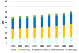 In Italia, la potenza complessiva installata da FER è aumentata lentamente negli ultimi anni e a fine 2022 risultava pari a circa 64 GW (+5% rispetto al 2021). La capacità di generazione termoelettrica, invece, si è assestata sui 60 GW. L’affermarsi delle FER ha determinato l’aumento della quota di energia prodotta al Sud e di quella da generazione distribuita: a fine 2022 il 36% della potenza installata proveniva da fonte non programmabile e il Sud e le isole rappresentavano il 40% della potenza installata totale.