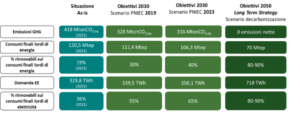 La bozza della nuova versione del PNIEC prevede un significativo innalzamento anche rispetto alla capacità di generazione da rinnovabile (+40% circa). Mentre l’unico valore che decresce riguarda la capacità installata di elettrolizzatori per la produzione di idrogeno verde, da 5 a 3 GW. Non sono stati definiti, invece, obiettivi espliciti in termini di capacità di accumulo necessaria per accompagnare la trasformazione del sistema elettrico. L’edizione del 2019 parlava di circa 10 GW (tra centralizzati e distribuiti).