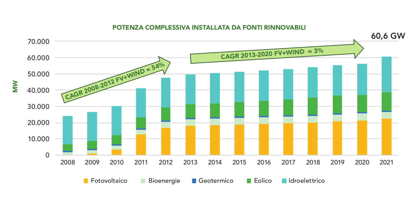 La crescita della potenza installata da fonti rinnovabili è fra le notizie emergenti: si tratta di più di 33 GW nel 2021, di cui circa 22,5 GW per il fotovoltaico e 11,3 GW per l’eolico. In calo la produzione di elettricità termoelettrica (-2,2 GW negli ultimi 5 anni), proveniente per il 77% da impianti alimentati a gas naturale, per il 17% da impianti a carbone (questi ultimi andranno dismessi entro il 2025) mentre biomasse e impianti a olio combustibile pesano il 3% ciascuno.