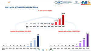 Una curiosità: nel 2023 è entrato in esercizio il primo sistema di accumulo accoppiato a un impianto rinnovabile marino. Si segnala l’incremento degli impianti fotovoltaici di potenza superiore a 1 MW. Questi si stanno dotando di sistemi di accumulo: nel 2023 si registrano 17 installazioni (750% rispetto al 2022).