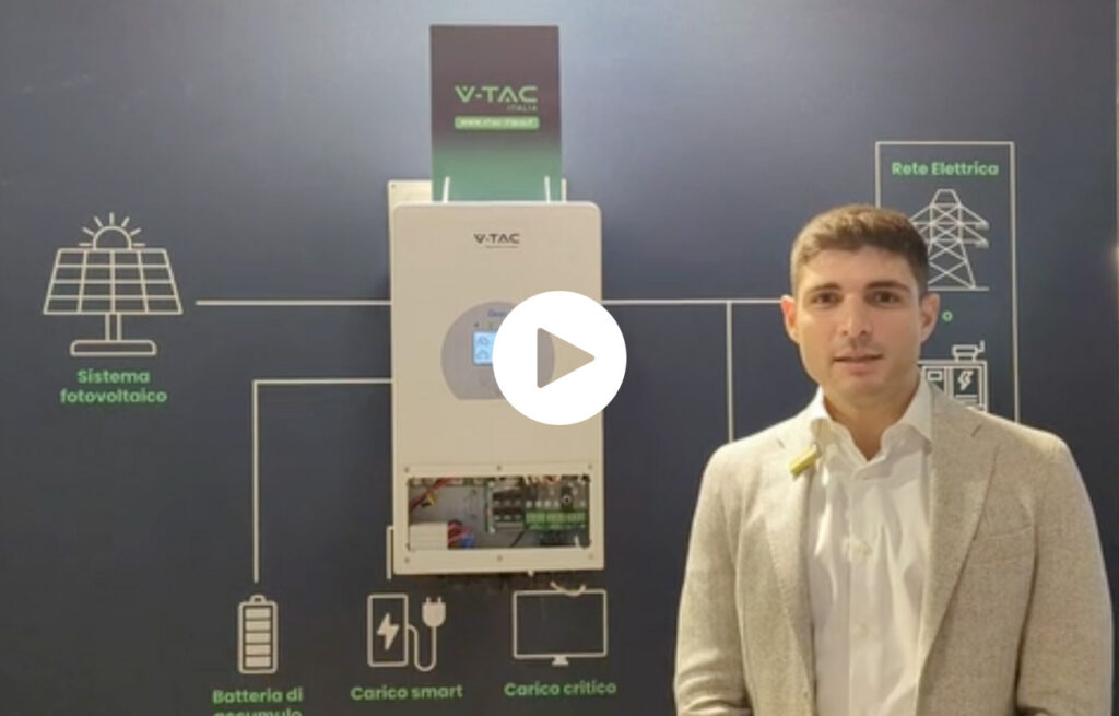 A Smart Building Expo 2023 Mirco Tedesco, Direzione Vendite V-TAC Italia, espone il funzionamento e i benefici di un inverter ibrido.